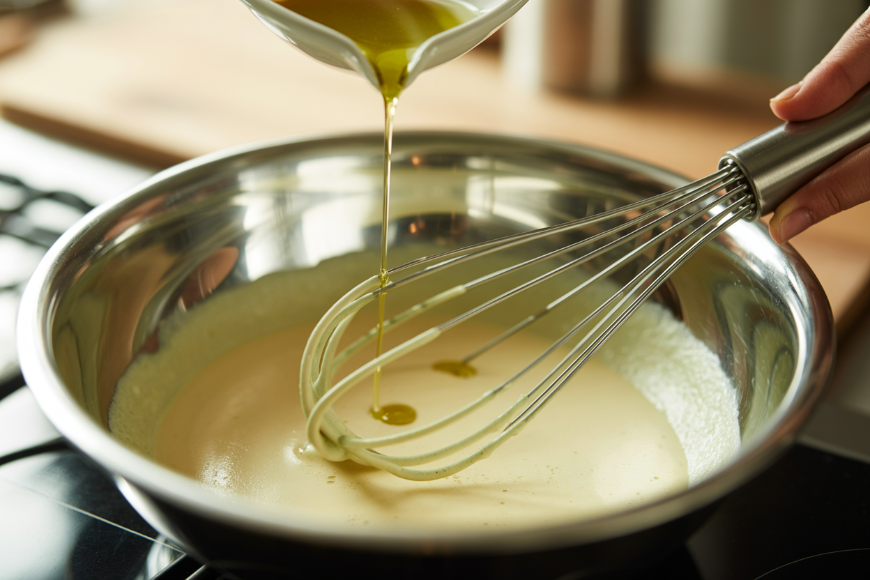When making mayonnaise or aioli, the oil must be added in a very thin stream—especially at the beginning. If you dump it in, the emulsifier cannot coat all the oil droplets fast enough, and the sauce separates into a greasy mess. Start with drops, then increase to a thin stream once the emulsion is established.2. Temperature Shock